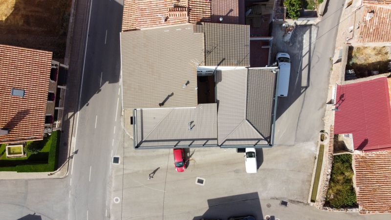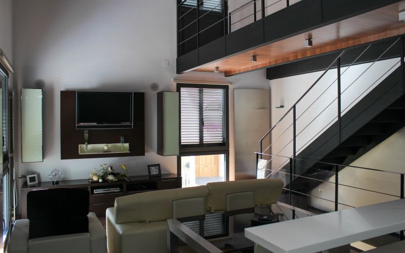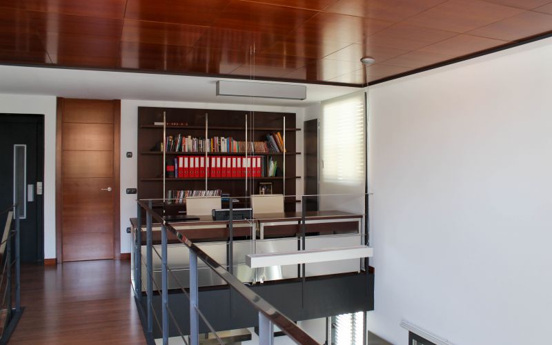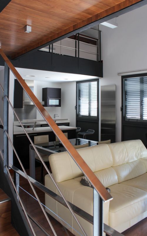 La vivienda se articula a partir de una escalera lineal y una doble altura que pone en relación el estudio y la zona de noche de la planta 2ª con el salón de la planta 1ª a través de una pasarela que se manifiesta en la fachada principal, mediante un balcón que marca la entrada principal de la vivienda.