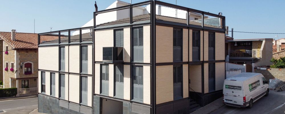 Formalmente el volumen construido presenta una composición tripartita, constituida por un zócalo de pizarra pulida, dos plantas nobles de vivienda y un remate superior que define el plano de cubierta cuya estructura de acero laminado modula los paños de ladrillo caravista blanco, articulando todo el conjunto. La sinceridad constructiva se traslada a la fachada de la vivienda ayudando a formalizarla.