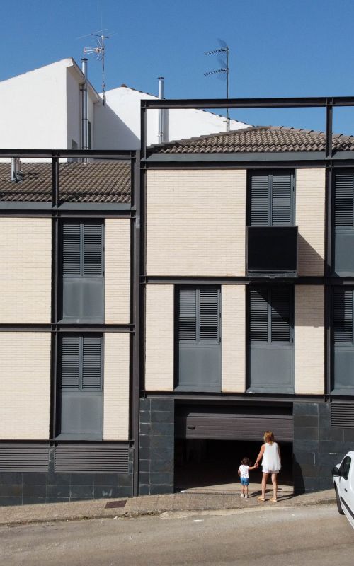 La vivienda se articula a partir de una escalera lineal y una doble altura que pone en relación el estudio y la zona de noche de la planta 2ª con el salón de la planta 1ª a través de una pasarela que se manifiesta en la fachada principal, mediante un balcón que marca la entrada principal de la vivienda.