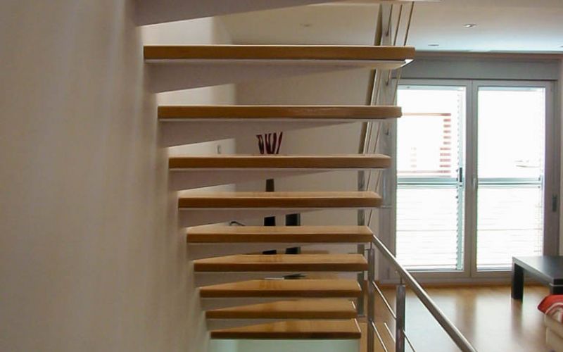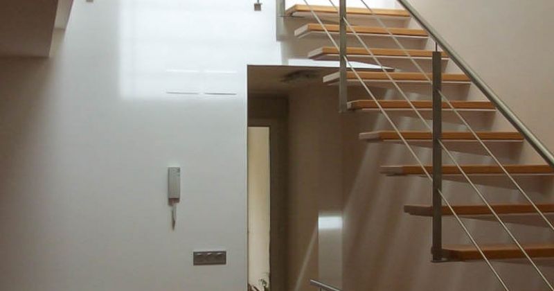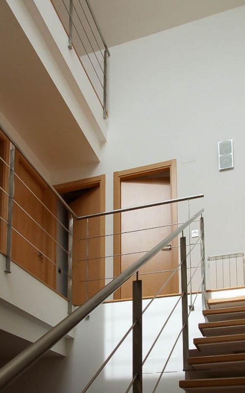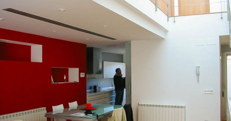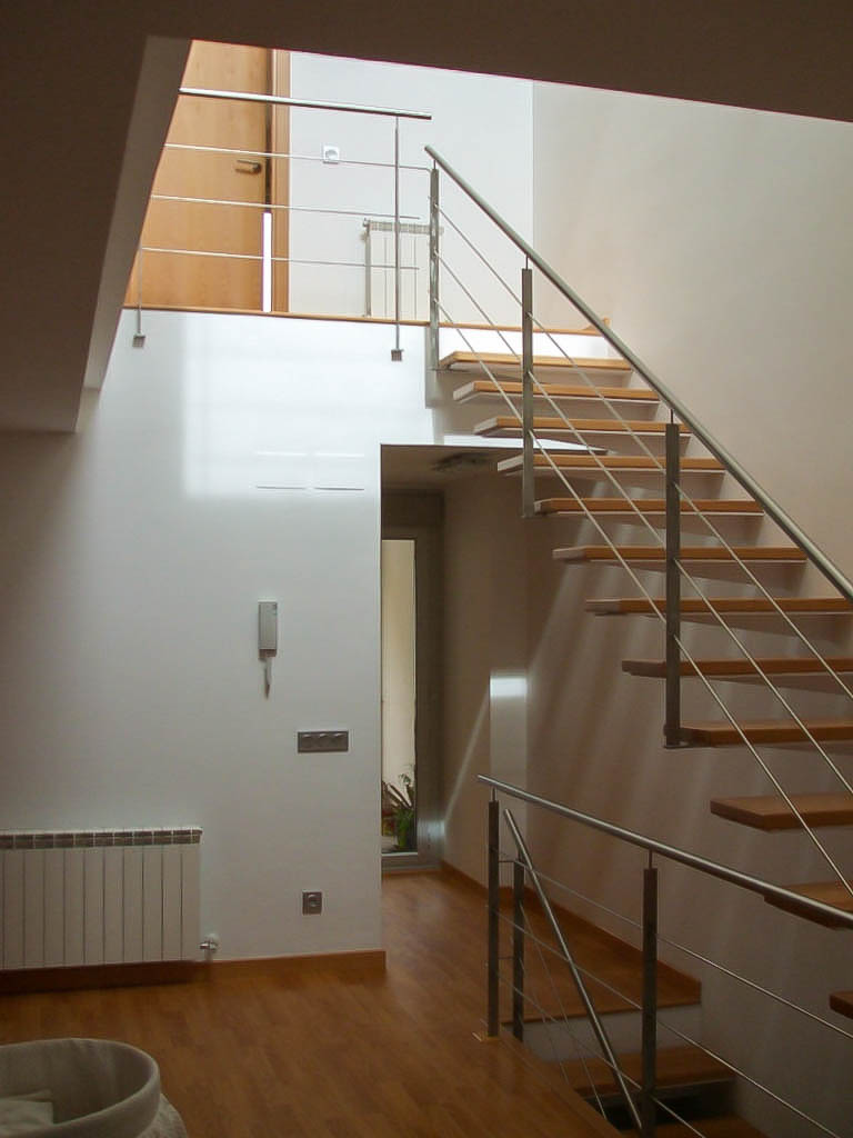 Además, oculta tras los baños, arranca una escalera secundaria que permite el acceso a la terraza de la cubierta, así como a un pequeño espacio bajo la cubierta inclinada que se puede utilizar como estudio y que vuelca sobre la doble altura del estar. Gracias a este recurso en sección se consigue la entrada de luz desde la cubierta al resto de las plantas inferiores. Prácticamente se puede hablar de que se trata de una casa-lucernario.