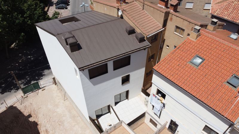 La vivienda proyectada se ha pretendido integrar en el entorno inmediato siguiendo los cánones compositivos analizados en el párrafo anterior, pero siguiendo un lenguaje actual, siendo fiel a la época en que se va a construir, ya que la arquitectura debe hablar de su tiempo y de su lugar, y a la vez anhelar la eternidad. Una composición clásica, con un lenguaje actual y abstracto tratará de dar respuesta a un entorno tradicional desde la modernidad, huyendo de mimetismos y de lenguajes anacrónicos y buscando una adecuada integración en el entorno inmediato. Para ello, se utilizará un material noble y tradicional como es el zinc tanto para la cubierta como para el zócalo y la logia de remate, el cual se integra cromáticamente con estos entornos históricos; dejando para la planta noble la utilización de un revestimiento de cal similar a los del entorno. Además, la composición de huecos duales con la predominancia del macizo y la componente vertical de los mismos trata de seguir el esquema compositivo de las edificaciones inmediatas.